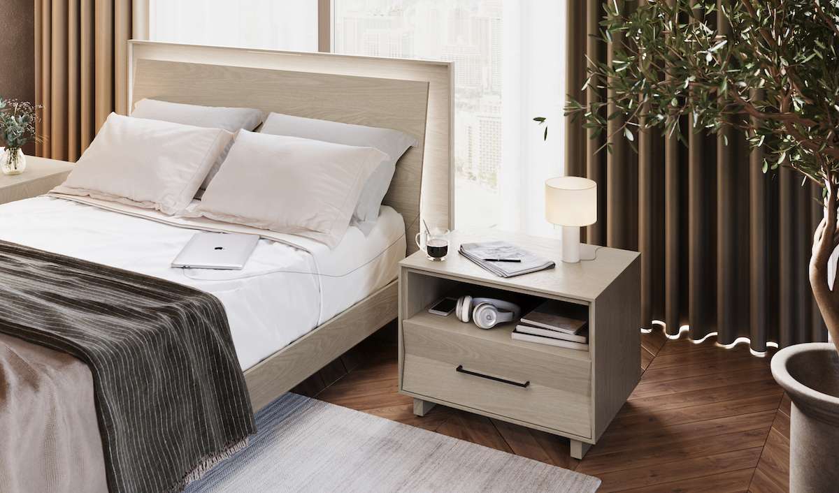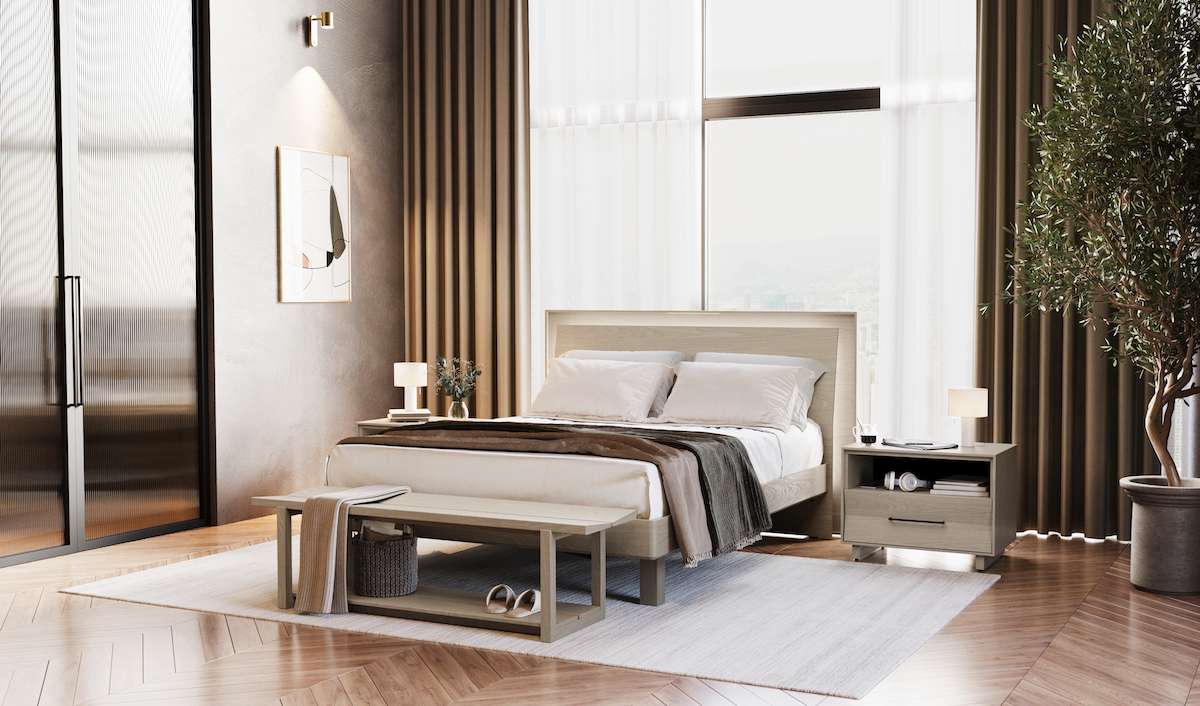 The KAVA King Bed balances geometric design with modern convenience, featuring built-in charging, dimmable lighting, and an adjustable-height frame for a seamless blend of style and function. See also, the KAVA Queen Bed.