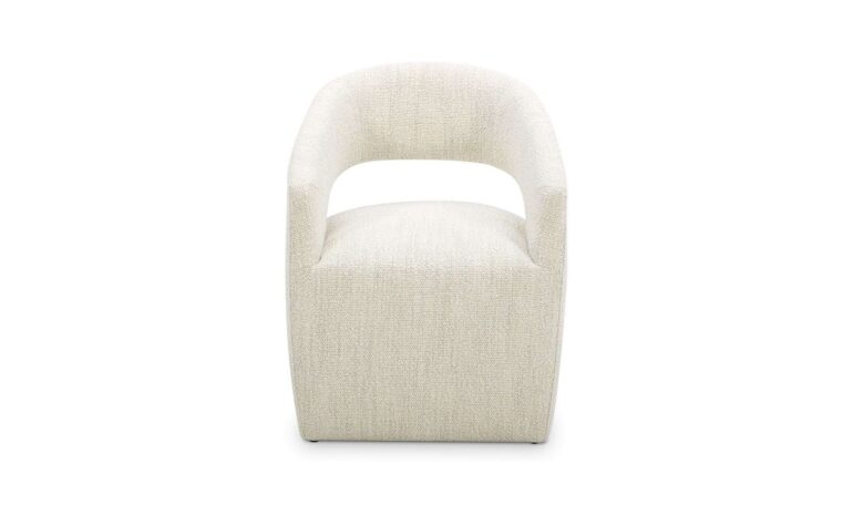 A contemporary dining chair upholstered with a NeverFear performance boucle, Barrow is easy to clean and easy on the eyes with a rolling base that lets you pass the peas and bounce from conversation to conversation. The curved back, along with the ultra-comfortable feather, high-density foam and poly-fill cushioned seat adds living room comfort to the dining experience.