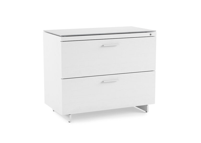 With spacious file drawers that can accommodate a high volume of letter and legal-sized hanging folders, the Centro 6416 White Lateral File Storage Cabinet by BDi is a satin white file storage cabinet that is high in both modern style and function. Innovative features include an anti-tip mechanism, a rear counterweight, an integrated lock that secures both drawers with a single key, and a highly durable grey satin-etched tempered glass top that can double as an additional work surface. It can be paired with the 6402 Return to create a compact and attractive workstation.