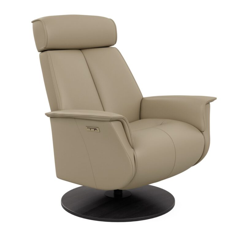 The Axle Dual Motor Recliner by Fjords provides exceptional support for your legs and back, featuring independent controls for the footrest and back position. The bases of the chair swivel for enhanced mobility. Available in all our leathers, the Axle Recliner includes a movable head pillow for superior comfort, and a manual release adjustable headrest angle for ergonomic head support. This chair is available in medium and large sizes.