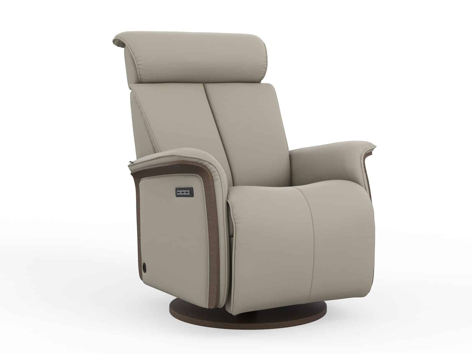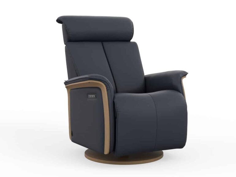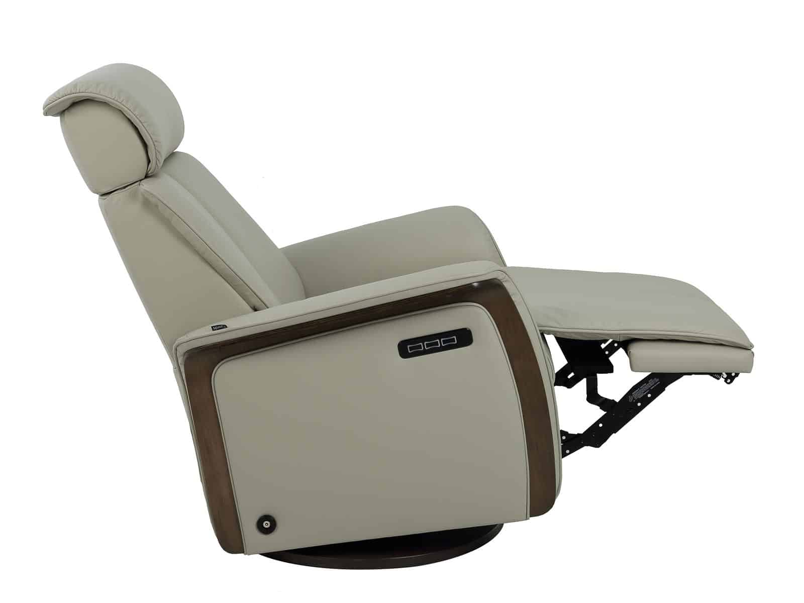 The Jewel Rome Swing Relaxer features an advanced three-motor system that allows for reclining, power lumbar support, and power head/neck support. These ergonomic details ensure optimal support for your lower back and neck, providing a comfortable seating experience. Available in all our leathers and select fabrics, the Jewel is offered in two sizes: small and large. The color matching wood base is standard on the Jewel.