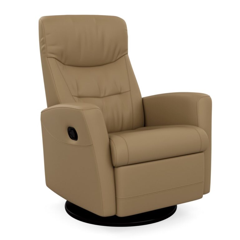 The Oslo Power Swing Relaxer by Fjords features a power headrest angle, making the seating experience ergonomic while providing correct support for your lower back. Available in all Fjords leathers and select fabrics, the Oslo is a versatile swivel/glider/rocker recliner offered in both motorized and manual versions. The design is available in two sizes, large and small, with a standard black base.