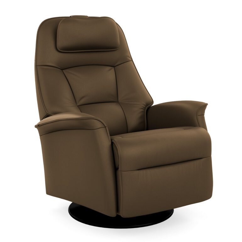 The Stockholm power swing relaxer is designed with your comfort in mind, featuring an adjustable head pillow and power headrest angle for optimal ergonomic support. This versatile chair is available in all Fjords leathers and select fabrics, offering a luxurious feel and aesthetic. As a swivel, glider, and rocker recliner, it provides exceptional versatility for any living space. The Stockholm comes in two sizes—small and large—ensuring the perfect fit for your needs. A standard black base adds a modern touch to the design.