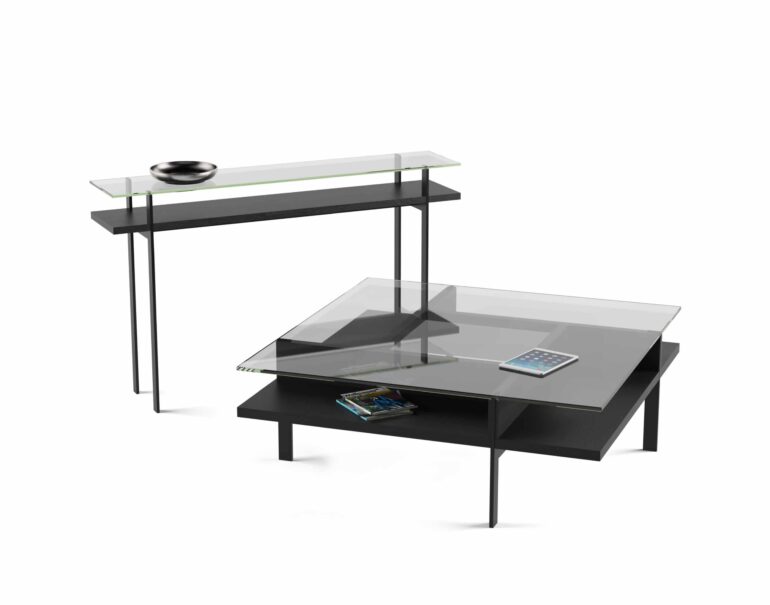 Terrace is a beautifully functional table grouping. Combining tempered glass tops, open display storage, and thick panels on steel supports, the collection includes two coffee table sizes, an end table, and a matching console.