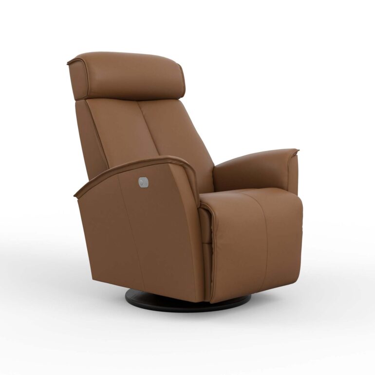 The Venice Swing Relaxer by Fjords features a height-adjustable headrest and power headrest angle, ensuring an ergonomic seating experience that provides correct support for your lower back. Available in all Fjords leathers and select fabrics, the Venice serves as a swivel/glider/rocker recliner and is offered in both motorized and manual versions. A standard black base enhances its sleek design.